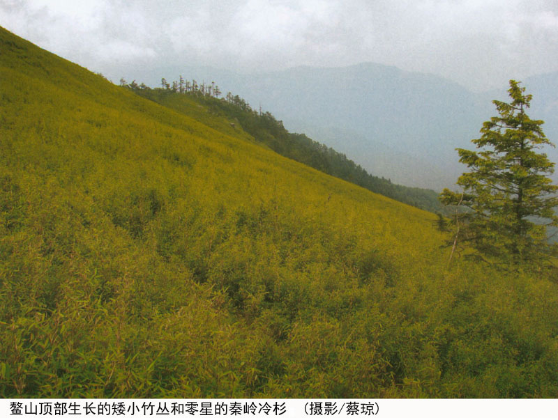 鳌山顶部生长的矮小竹丛和零星的秦岭冷杉