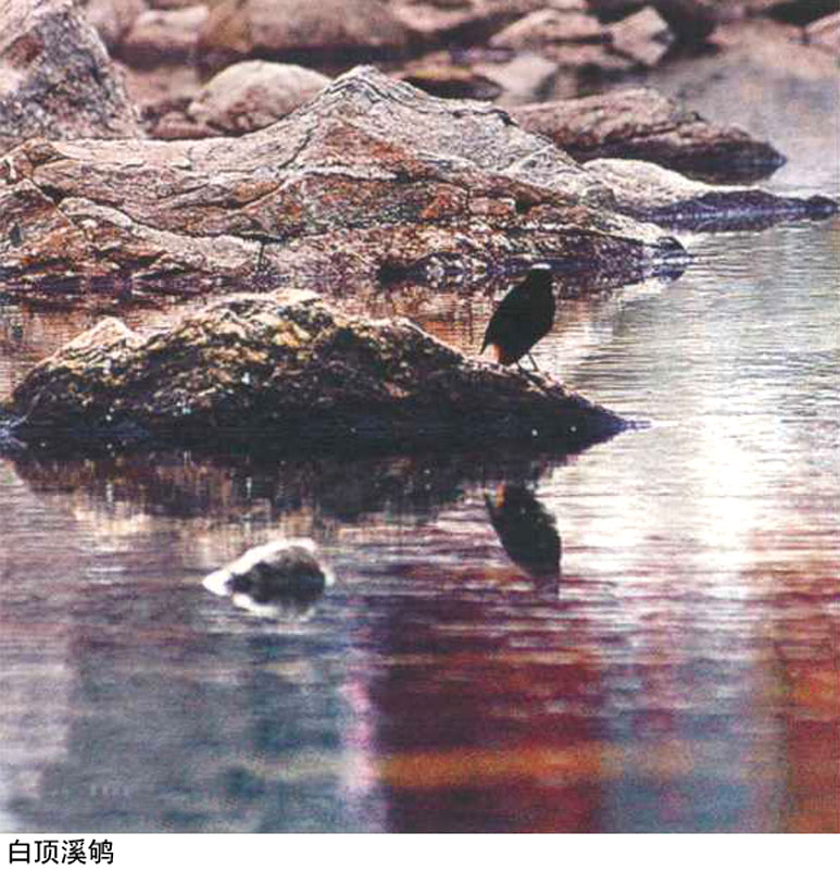 夏季,在太白山上的一些湖边还生活着一种奇特的鸟,名叫白顶溪鸲,其大小和燕子相近,背部乌黑,腹部红褐,头顶有一白色斑纹,鸣叫啾啾,飞行敏捷,以水中浮游生物和小草细叶为食,故常在水面和湖边觅食。韩愈曾写诗描写道:“鱼虾可俯掇,神物安敢寇。林柯有脱叶,欲堕鸟惊救。争衔弯环飞,投弃急哺毂。”这种鸟更有趣的是,有时湖上落叶太大,一只鸟衔不动,会有两只鸟同衔一片树叶。千百年来人们喜欢这种鸟尽力保护池水环境卫生的美德,称颂它是“净水童子”、“净池鸟”。
